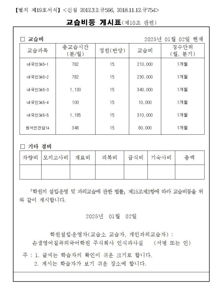 손샘영어 칠곡원 교습비 안내